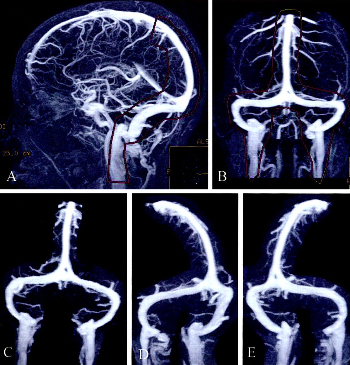 ATECO MRV的技术开发机构,用于这项研究之前已经详细描述6目前的标准方法,静脉造影术在我们的机构。所有考试先生进行了超导1.5 - t系统先生(标记Echospeed,版本8.2.3软件;通用电气医疗系统,密尔沃基,WI)标准头线圈。所有考试包括T1和t2加权序列以及ATECO MRV序列。ATECO MRV检查包括四个组成部分:1)启动一个2 d,单片、丸面向检测序列在轴向平面位于海绵颈动脉的水平;2)静脉注入对比剂;3)自动检测的到来经提醒对比剂在海绵颈动脉水平,导致自动终止检测序列,插入4)8秒延迟,并触发的快速三维梯度回波MRA与椭圆中心命令序列相位编码。这么快面向SPGR序列在矢状面覆盖从耳朵到耳朵用以下参数:重复时间msec / echo msec: 7/1.6;翻转角度:35°;部分回波采集; field of view: 25 cm; matrix: 320 × 320; bandwidth: 62.5.0 kHz; section thickness: 1.3 mm; and 124 sections resulting in a 16 cm thick volume; and scan time: 4:38. Resultant voxel dimensions were 0.78 × 0.78 × 1.3mm (this resolution was obtained without zero filling techniques).