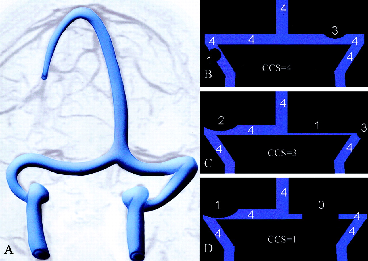 图2。系统的原理图用于分级横向的开放和乙状窦。每个左翼和右翼的年级transverse-sigmoid管道分别确定和定义的最高程度的狭窄远端从torcula遇到乙状窦并给予相应的数字从0到4。0 =不连续(gap)或再生障碍性段;1 =发育不全或严重狭窄段的管道内估计不到25%的横截面直径的远端上矢状窦腔;2 =中度狭窄的部分管道(25 - 50%),3 =轻度缩小部分(50 - 75%);和4 =无显著缩小(75 - 100%)。左翼和右翼的和合并后的管道提供得分(CCS)和通常范围从2 - 8。(A)正常情况下,每一个左翼和右翼管道将得分4的合成CCS 8,和(B, C,以及D)示意图CCS 4的例子,3,1。