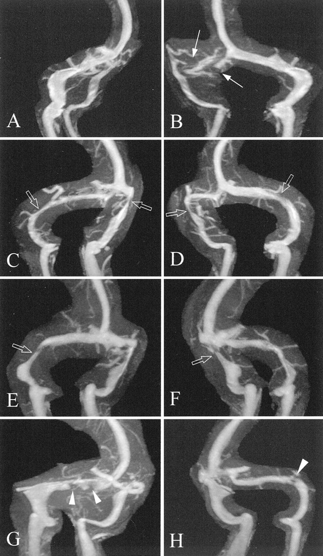 图3。Auto-triggered elliptic-centric-ordered三维gadolinium-enhanced先生造影术发现颅内高压症患者。老挝和饶分段最大强度投影(A和B)病人77;(C和D)病人36;和(E和F)病人8。(A)不连续(得分= 0)被认为在右侧横窦(箭头)(B)。extralumenal压狭窄的例子(打开箭头)在(B-F)。经管障碍物的例子被认为双边(箭头)病人69 (G和H)。