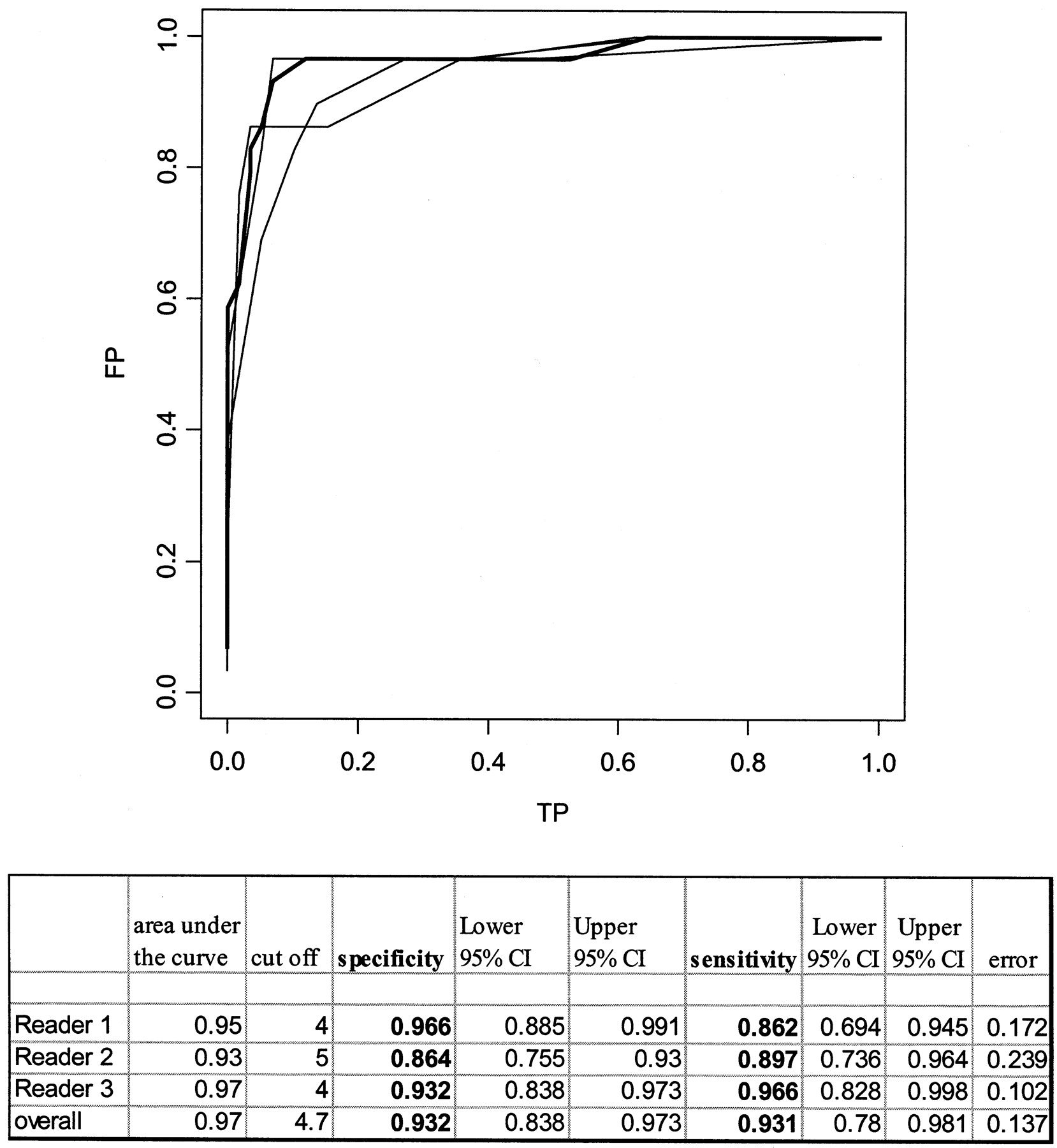 图4。ROC曲线为每个读者和整体组合生成曲线(粗体)计算的一部分数据用于生成这些曲线显示在下表中。“阈值”(切断)是读者的CCS的所有分数等于和它下面显示颅内高压症的存在。敏感性和特异性的“阈值”。平均的“阈值”联合静脉导管得分也是“整体”行所示。