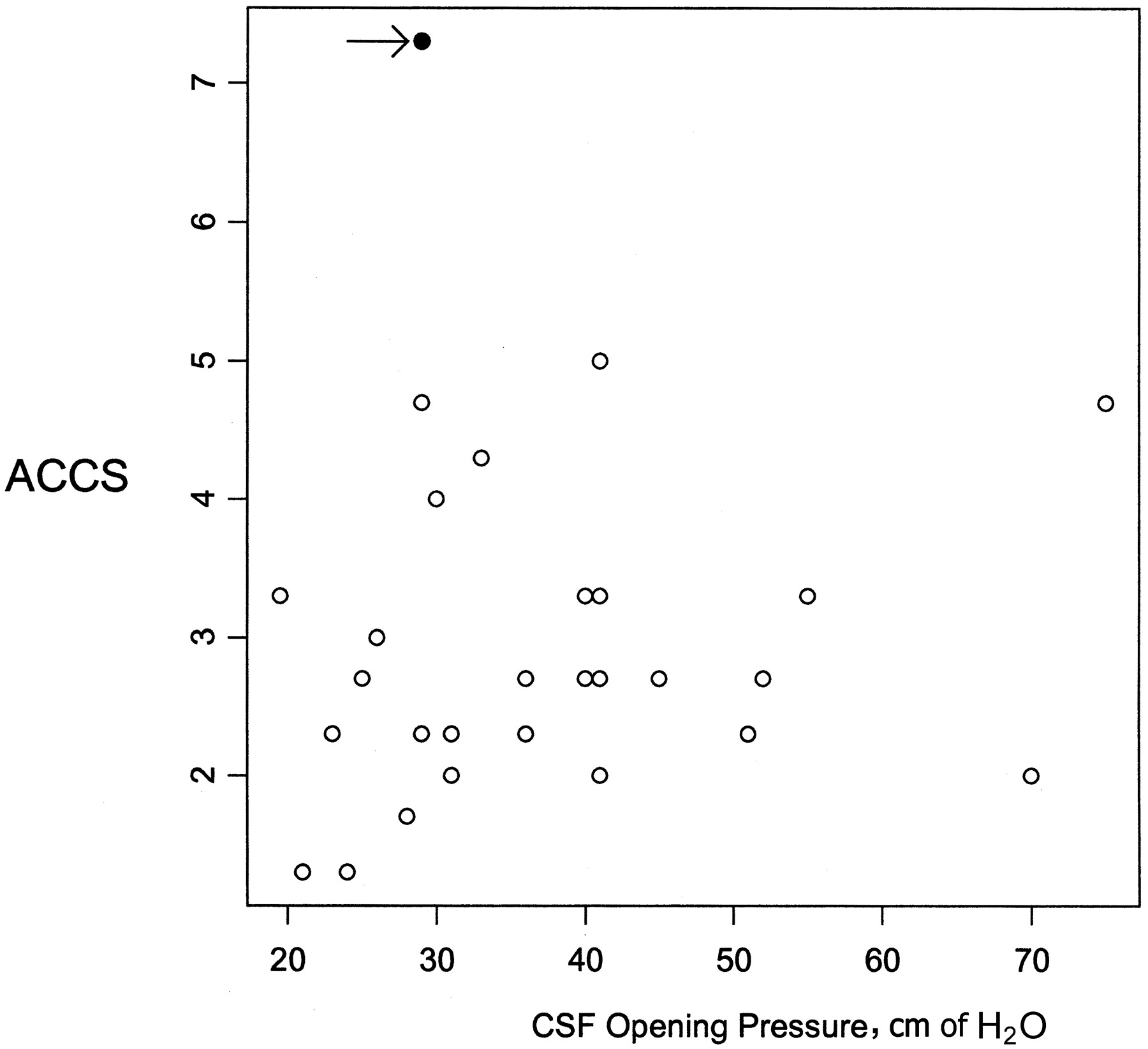 共有88名患者被随机分配和评价这三个读者。两两之间的协议三个读者为他们蒙蔽分级CCS的每个病人(颅内高压症或控制)是使用加权kappa统计评估。7评价读者1和2之间的协议取得了kappa值为0.73;读者1和3之间kappa值为0.66;和读者之间的两个和三个kappa值为0.67。所有三个读者之间协议的总体水平是评估使用肯德尔和谐系数测量0.90表明优秀的协议在读者分级CCS。8-操作者特征(ROC)曲线(一个常用的工具来评估诊断测试的性能9)是构造为每个读者以及平均的三个读者。曲线下的面积及其相关标准误差是计算使用Mann-Whitney等价U测试(图4)。9每个ROC曲线下的面积从0.93到-0.97不等。ACCS控制的分布和颅内高压症病人如图(E) 1上首页网站(www.neurology.org首页)。敏感性和特异性ACCS使用一系列的计算值。ACCS值低于5.0最好的正常和异常的静脉导管之间的歧视。除了两个病人(假阴性),所有颅内高压症患者ACCS小于5.0。四个控制患者(假阳性)的ACCS小于5.0。小于5.0的ACCS原本正常的患者大脑的核磁共振显示颅内高压症的存在的敏感性93%,特异性93%。颅内高压症患者sinovenous狭窄的原因是由于一个明显的经管充盈缺损13个横向鼻窦45 vs extralumenal压缩。散点图和皮尔逊相关性之间的关系被用来评估CSF开启压力和ACCS (图5)。ACCS和脑脊液压力没有明显相关性。