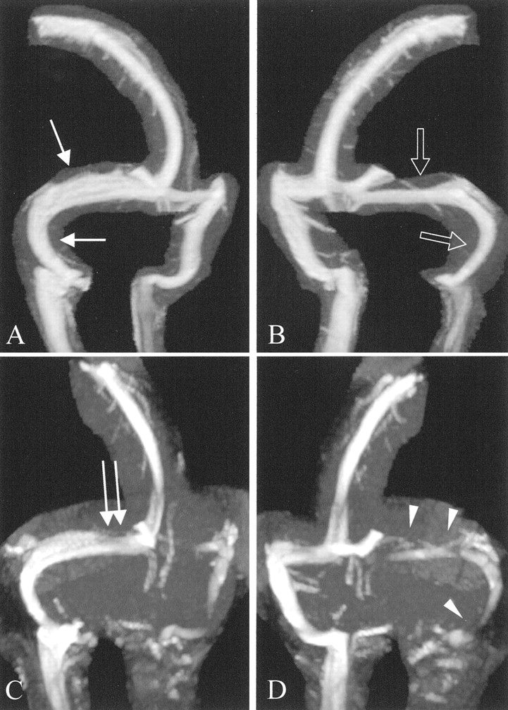 图6。ATECO vs TOF MRV。(一)老挝和(B)拉奥分段最大强度投影(MIPs) ATECO MRV的控制病人展示良好的可视化的右(箭头)和左(打开箭头)横向和乙状窦。注意缺乏artifactual信号损失。(C和D)相应oblique-segmented MIPs从TOF MRV在同一病人获得先生在同一考试。注意信号的大量artifactual损失近端右横窦(弯曲的箭头)和最左横窦(箭头)。