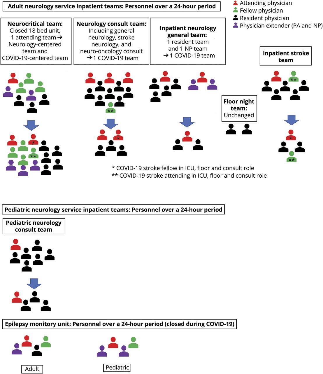 住院的领导和我们总住院医师开发计划缩减我们的住院服务必要的人员包括居民学员(图)。重新部署备份计划和定义技能(住院病人临床门诊临床、管理和语言技能)对学员进行,neurohospitalists, neurocritical护理团队。医学生和观察家们从临床服务3月初是我们医院的规定。所有团队实践社会距离当舍入和教学是发生在工作室,而不是在床边。我们团队成员的数量最小化进入病人的房间,然后,或者那些COVID-19积极参加。我们是捆绑销售订单和调整日常保健(即。,laboratory draws, the frequency of neurologic checks, and timing of medication administration) to the minimum to provide adequate care while being conscientious of nursing exposure time in PUI and COVID+ rooms.