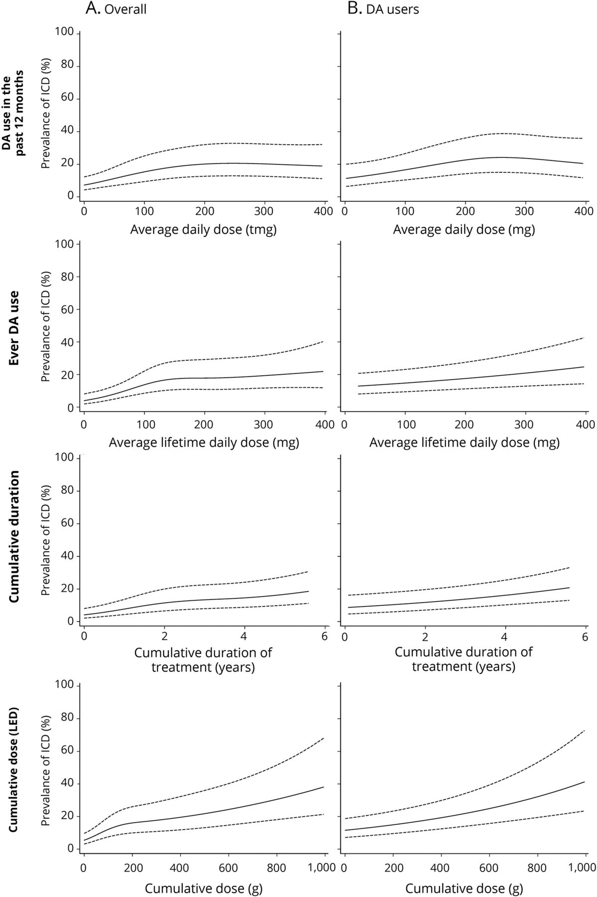 分析总结了DA和接口控制文件之间的关系表2。达使用在过去的12个月中与ICD患病率较高(2.23倍p< 0.001)。ICD患病率增加在过去12个月中,平均每日剂量但样条函数显示一个偏离线性(p< 0.001),高原上面≈150 mg / d LD等价物;类似的模式是在用户(图2)。有人看见一个更强大的协会永远达4.23 (PR)使用。ICD患病率增加,平均每日DA剂量,但曲线显示偏离线性(p< 0.001)。没有偏离线性用户,ICD的发病率增加了16%(95%可信区间4% - -29%)/ 1-SD增加剂量。类似的模式观察累计持续时间和剂量。样条函数提出了一个偏离线性整体,分析限制用户建议线性量效关系,为39% (95% CI 14% - -71%)和32%(95%可信区间17% - -49%)每1-SD更高的患病率增加累计持续时间和剂量,分别。最终的模型包括累计持续时间和平均每日剂量显示与2变量的线性关联,强剂量的一半时间,整体和用户。之间没有交互作用剂量和持续时间(整体p= 0.29,用户p= 0.20)。总的来说,这个模型有一个适合(QIC 1902)类似的基于样条函数永远DA使用(QIC 1902)和累积剂量(QIC 1903)。在用户,它提供了最适合(QIC 1902)。