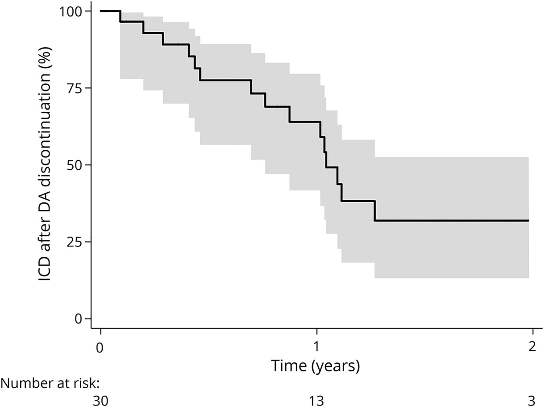 三十的icd患者停止服用之后DAs随访。ICDs逐步解决,有50%的病人没有ICDs DA停药后1年(图3)。