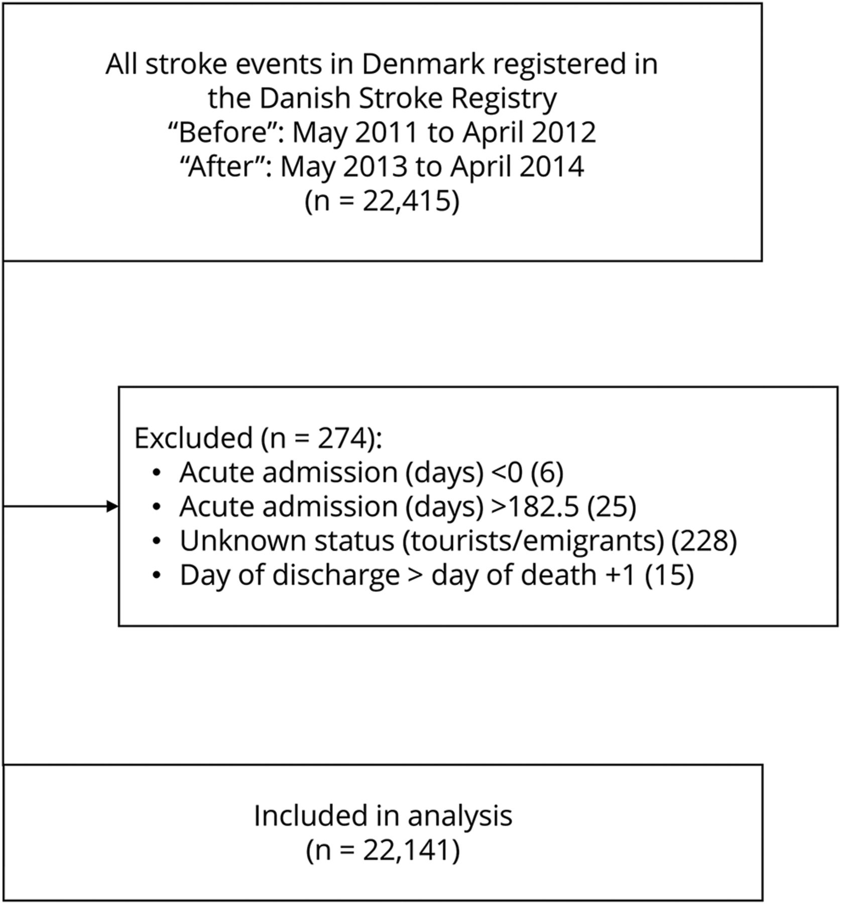我们进行了一项前瞻性前后队列研究使用剩下的丹麦(≈430万居民)比较基础总体趋势在中风病人护理和结果法()方法。“之前”时期被定义为前12个月的重组(2011年5月1日- 4月30日,2012),和“后”时期被定义为开始的12个月里的重组开始后的1年时间的转变被认为已经完全实现(2013年5月1日- 4月30日,2014)。