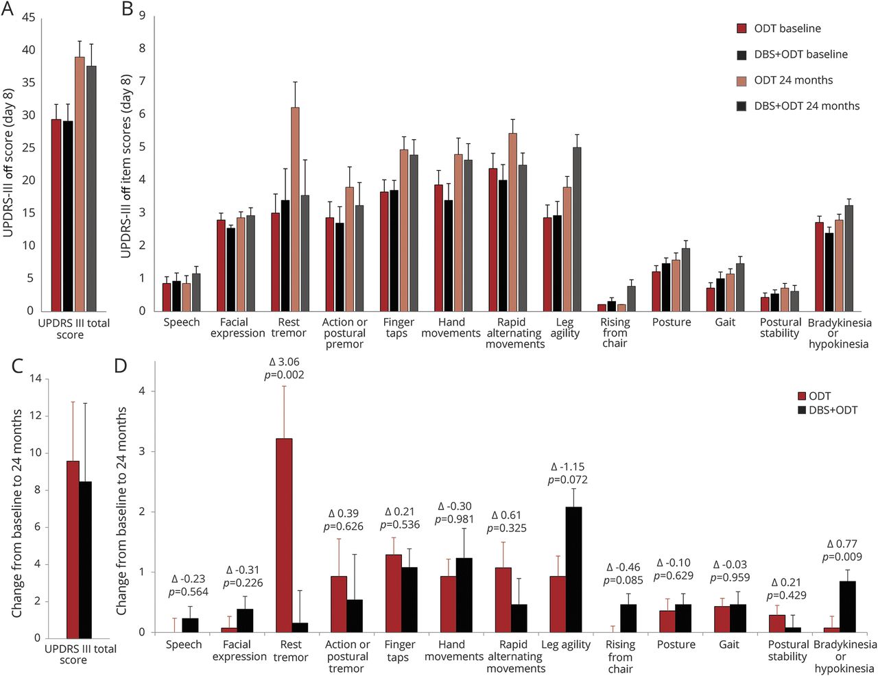 均值±SEM UPDRS-III分数后7天冲刷(8天)治疗组(n = 14日最佳药物治疗(ODT);n = 13,脑深部电刺激(DBS) + ODT)和平均±SEM分数从基线到24个月的变化。(一)UPDRS-III总分(不包括刚度)在基线和24个月。(B) UPDRS-III条目分数在基线和24个月。(C)的变化UPDRS-III总分从基线到24个月(不包括刚度)。(D)改变UPDRS-III条目分数从基线到24个月。Δ= ODT - DBS + ODT差异变化从基线到24个月;p价值观决定从Wilcoxon rank-sum测试;*p< 0.0038(0.05/13)为分析被认为是显著的。