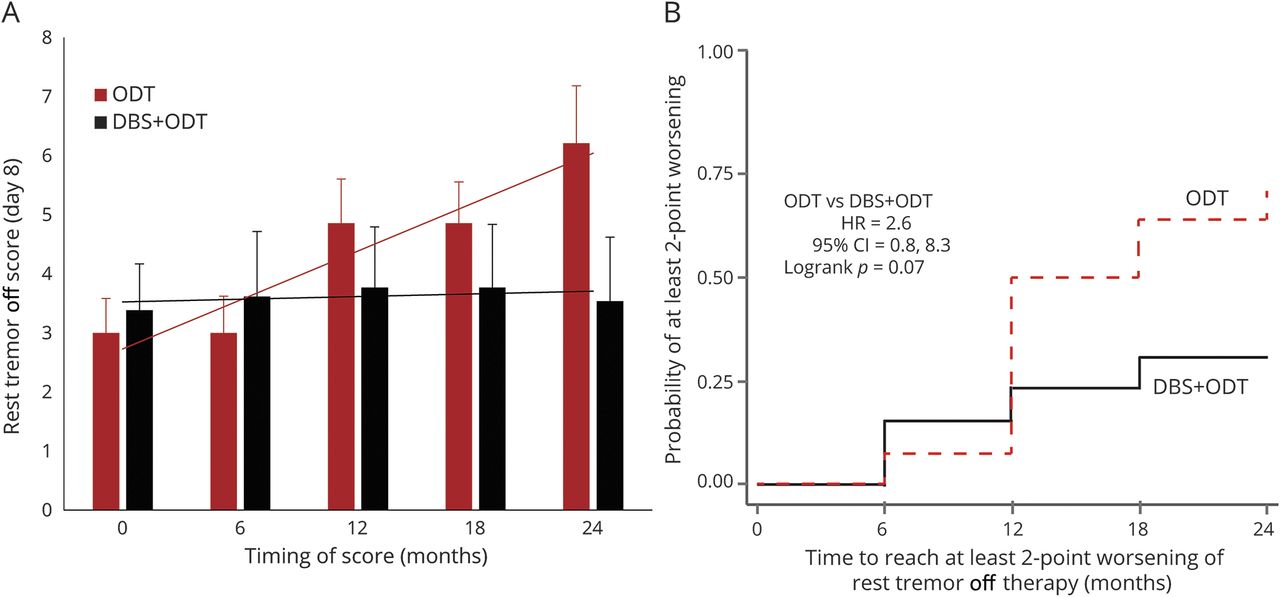 UPDRS-III休息震颤评分后7天冲刷(8天)治疗组(n = 14日最佳药物治疗(ODT);n = 13,脑深部电刺激(DBS) + ODT)。(A)意味着±SEM其他地震“关闭”得分在基线和6,12日,18日和24个月的治疗组,回归行显示每组的得分的趋势随着时间的推移。的p值DBS + ODT vs ODT区别其他地震“关闭”得分趋势(斜坡差异=−1.97点/ y)决定从一个2自由度χ2协方差分析的测试分数的变化从基线,基线调整分数和within-patient相关性和在0.01显著水平(p< 0.001,可交换的相关性)。模型改变其他地震“关闭”分数随时间:改变其他地震“关闭”得分= 1.93 (y) + 1.04××时间DBS−1.97×DBS (y)−0.05××时间基线其他地震“关闭”得分−0.53。(B)休息时间至少达到2点恶化震颤评分“关闭”疗法。风险比(人力资源)和95%可信区间(CI)是来自Cox回归模型以治疗组为单变量模型;的p价值是由生存率较确定的。