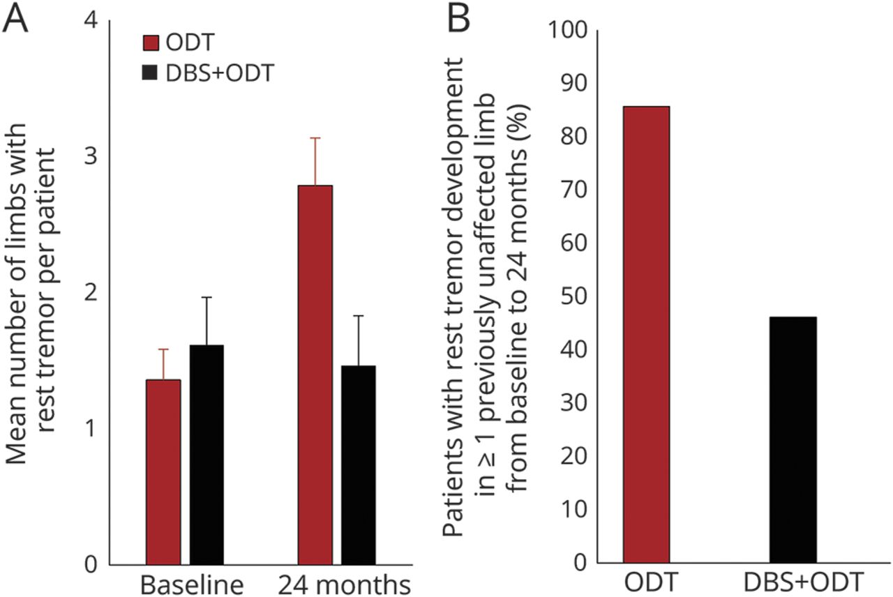 四肢的数量受到其他地震(脸,右手,左手,右腿,左腿)在基线评估每个病人,24个月,意味着改变从基线到24个月使用2-sample组间比较t测试与平等的方差。每个病人也休息之前影响四肢震颤发展评估。新创发展定义每个肢体没有基线其他地震现在(问题20 UPDRS-III“关闭”项目得分= 0)和非零24个月休息震颤项严重程度得分。患者其他地震发生在至少一个肢体24个月被分类开发地震新创休息。Fisher精确检验是用来评估治疗组之间的差异的风险新创休息震颤发展(发展与不发展)。p< 0.05被认为是重要的。