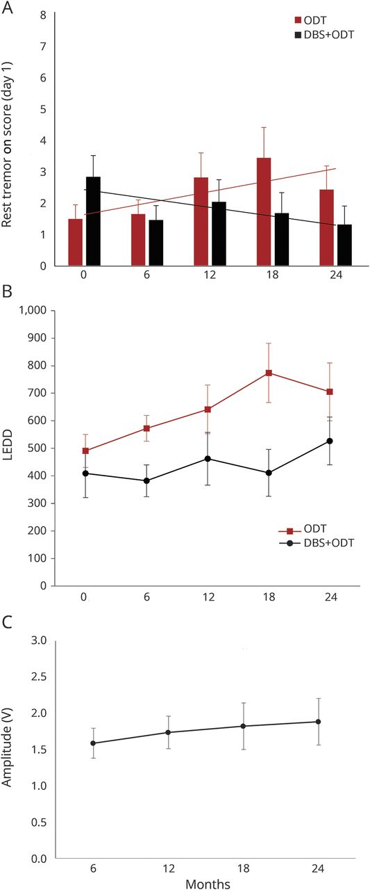 (A)意味着±SEM UPDRS-III休息震颤评分”“治疗(第一天)治疗组(n = 13,最佳药物治疗(ODT);脑深部刺激(DBS) n = 14日+ ODT)随着时间的回归直线显示每组的得分的趋势随着时间的推移。的p值DBS + ODT vs ODT区别其他地震”在“分数的趋势(斜坡差异=−0.74点/年)决定从一个2自由度χ2协方差分析的测试分数的变化从基线,基线调整分数和within-patient相关性和在0.01显著水平(p= 0.003,可交换的相关性)。模型改变其他地震”“分数随时间:改变其他地震”在“分数= 0.58×时间(y)−0.90×DBS−0.74×DBS时间(年)−0.34××基线其他地震”在“分数+ 0.84。(B)均值±SEM左旋多巴等效剂量(LEDD) ODT (n = 14)和DBS + ODT (n = 14)在24个月的研究期间。(C)刺激措施(130 Hz,脉冲宽度60 ms)。均值±SEM刺激振幅DBS + ODT组(n = 14)。振幅显示为平均水平左右。V =电压。振幅范围= 1.0 - -2.4 V。6