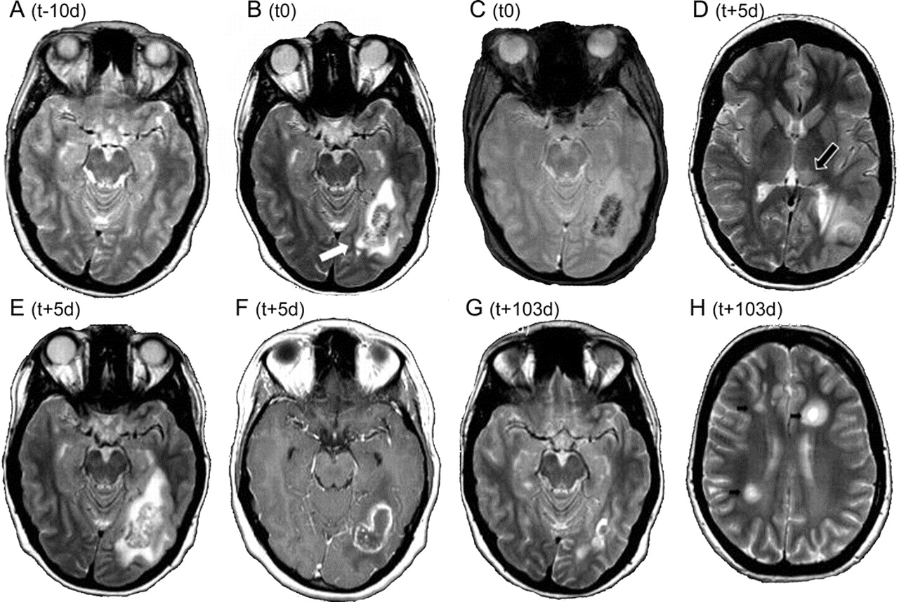 括号表示在入院时间。(A, t2加权[T2W])常规颅MRI出现临床症状前10天没有异常。承认(B, T2W)相应的图像显示hypointense非齐次结构有着明显的病灶周边水肿(白色箭头)在左颞顶白质与易感性工件对应于出血性转换(C, T2 * W)。五天出现症状后,一个新的T2W hyperintense病变在左丘脑枕是注意到(D, T2W,黑色箭头)。左颞顶病变的大小和水肿的进展(E, T2W)和强perilesional增强钆注射后观察到的(F, T1W)。入院后103天,病灶周边大脑的损伤是有缺陷的,没有反应实质(G, T2W)。新多发性硬化症可疑病变(H, T2W,小箭头)出现在皮层下白质。这些都是钆增强(没有显示)。
