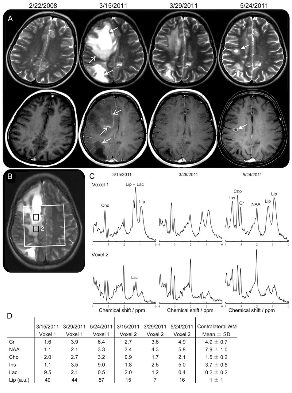 (A)轴向T2(上面一行)和gadolinium-enhanced t1加权磁共振成像(底下一行)说明损伤演化在基线(2008年2月22日),在录取的时候我们医院(2011年3月15日),和随访期间(2011年3月29日,2011年5月24日)。2011年3月15日,病人出现块状病变簇状多焦点的两个半球特别是右边。病变的一部分在t2加权像上显示坏死和囊性外观(关闭头箭头)和其他部分显示出积极的迹象脱髓鞘与血脑屏障的破坏导致对比度增强(打开头箭头)。immune-modulating治疗停止后,脱髓鞘区域的体积减少,暗示remyelination,对比度增强消失(2011年3月29日,看到MRI)。然而,在后续新多发性硬化病变活动性炎症的对比度增强发生(封闭的头部MRI的箭头5月24日,2011)。(B)定量化学位移成像(CSI)进行新闻本地化(重复时间/回波时间3000/30毫秒),与巨大的白色表示感兴趣的体积。(C)上面一行:纵向光谱从体素1在囊性/坏死区。最初的光谱(2011年3月15日)显示了一个几乎没有完整的所有代谢产物除了choline-containing化合物(Cho)由于膜退化。它也显示了一个巨大的海拔乳酸(Lac)由于炎症组件,和脂质(唇)符合巨噬细胞的存在。随着时间的推移(2011年3月29日,5月24日,2011),NAA略有改善,但仍低,由于neuro-axonal损失或损害,而肌酸(Cr)、肌醇(Ins),由于神经胶质增生和曹强烈增加。 Lac has diminished, but Lip remains very prominent. Bottom row: longitudinal spectra from the surrounding border (voxel 2) are initially characterized by a reduced concentration of all metabolites, probably due to the diluting effect of edema, and the presence of Lac. Over time, the spectra almost normalize, although NAA remains slightly reduced and some lipid signals remain visible. (D) Metabolite concentrations (in mmol/L) corresponding to these spectra were quantified with LCModel, and compared to concentrations in contralateral white matter (WM).