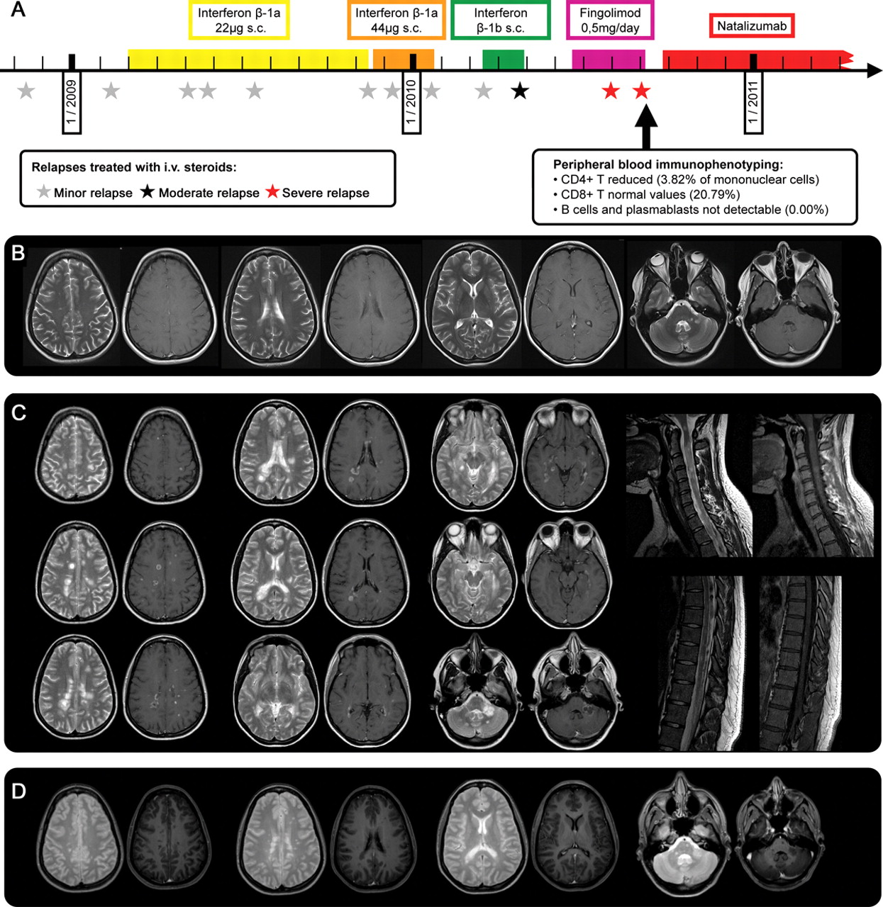 一名26岁的女性被诊断为复发缓和女士在2009年2月的一集后轻微感觉赤字。她用干扰素治疗β-1a停止在2010年1月由于肝酶升高,而转向干扰素β-1b 2个月后。尽管7 steroid-responsive复发她扩大残疾状态量表(eds)保持稳定(1.0 - 1.5),直到2010年4月底(图A和B),当她第一次温和复发2.5 (eds)。假设缺乏治疗的疗效,病人停止干扰素治疗但拒绝治疗natalizumab出于安全考虑。最终她在参加一个开放性fingolimod试验6月19日,2010年。